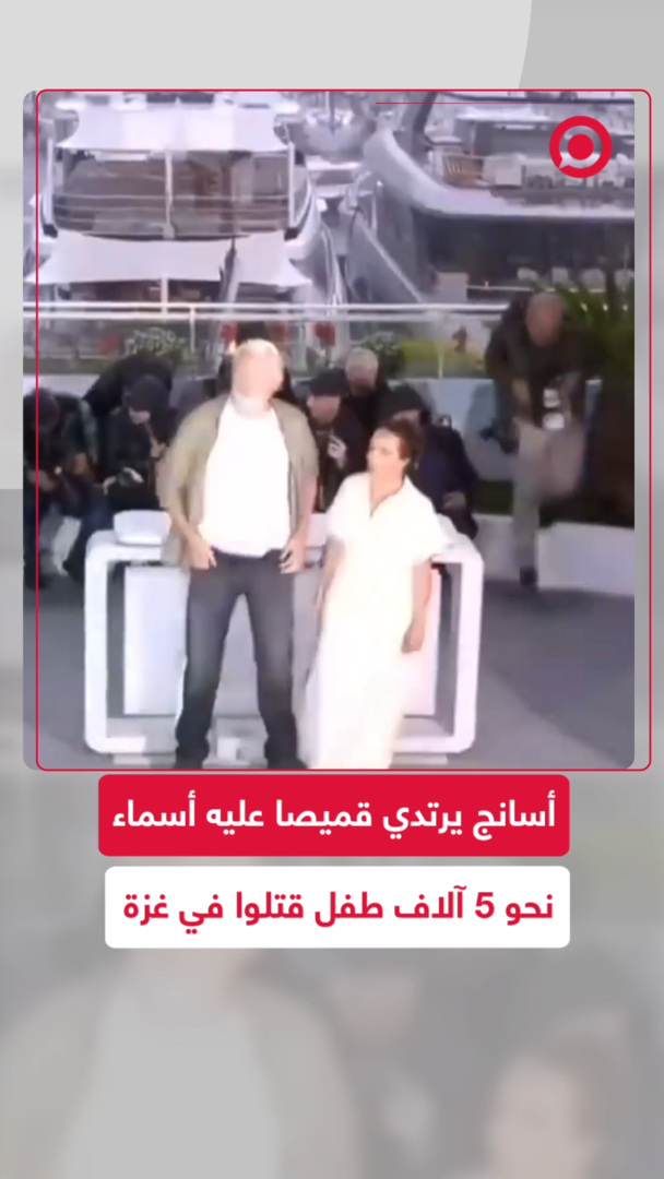 أسماء نحو 5 آلاف طفل قتلوا في غزة.. مؤسس موقع "ويكيليكس"، جوليان أسانج، شارك في مهرجان "كان" السينمائي مرتديا قميصا يحمل أسماء 4 آلاف و986 طفلا فلسطينيا قتلوا في القصف الإسرائيلي في قطاع غزة.