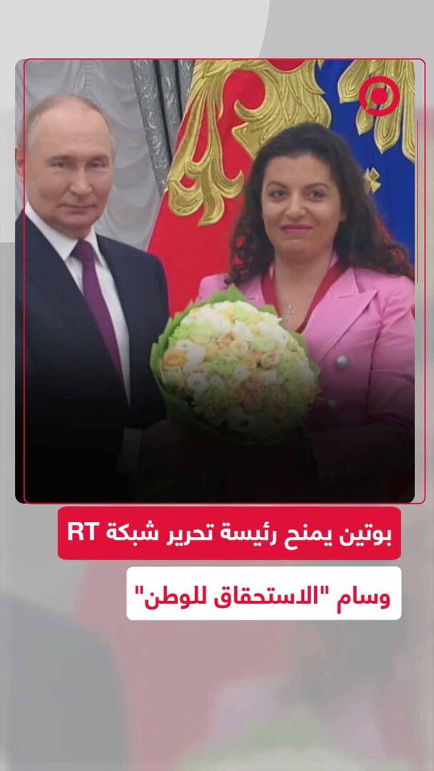 بوتين يمنح رئيسة تحرير شبكة RT، مارغاريتا سيمونيان، وسام "الاستحقاق للوطن" من الدرجة الثالثة