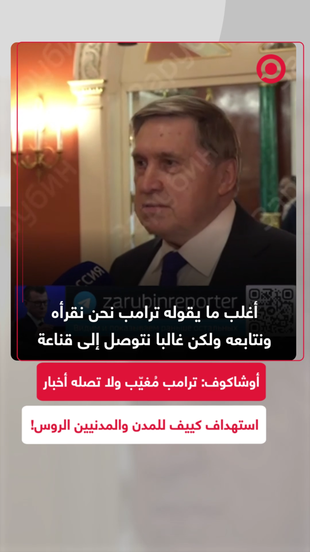 مساعد الرئيس الروسي، يوري أوشاكوف، يؤكد أن متابعة الجانب الروسي لتصريحات الرئيس الأمريكي دونالد ترامب، تؤكد أن ترامب لا تصله معلومات كافية بشأن ما يحدث في الصراع الروسي الأوكراني وبالأخص لا تصله معلومات عن الهجمات الإرهابية المتزايدة التي تقوم بها أوكرانيا ضد المواطنين الروس المدنيين والمدن الروسية.