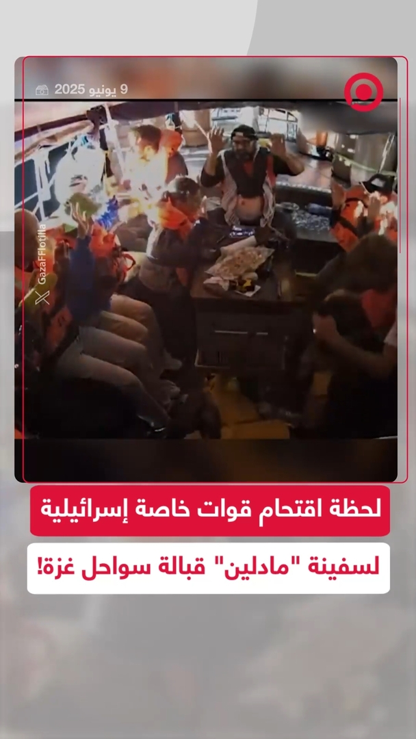 وثقتها كاميرا مراقبة مثبتة على متن السفينة.. لحظة اقتحام قوات خاصة إسرائيلية لسفينة "مادلين"، التي كانت في طريقها لكسر الحصار المفروض على قطاع غزة، في مشهد أعاد إلى الأذهان أحداث سفينة "مرمرة" التركية عام 2010.