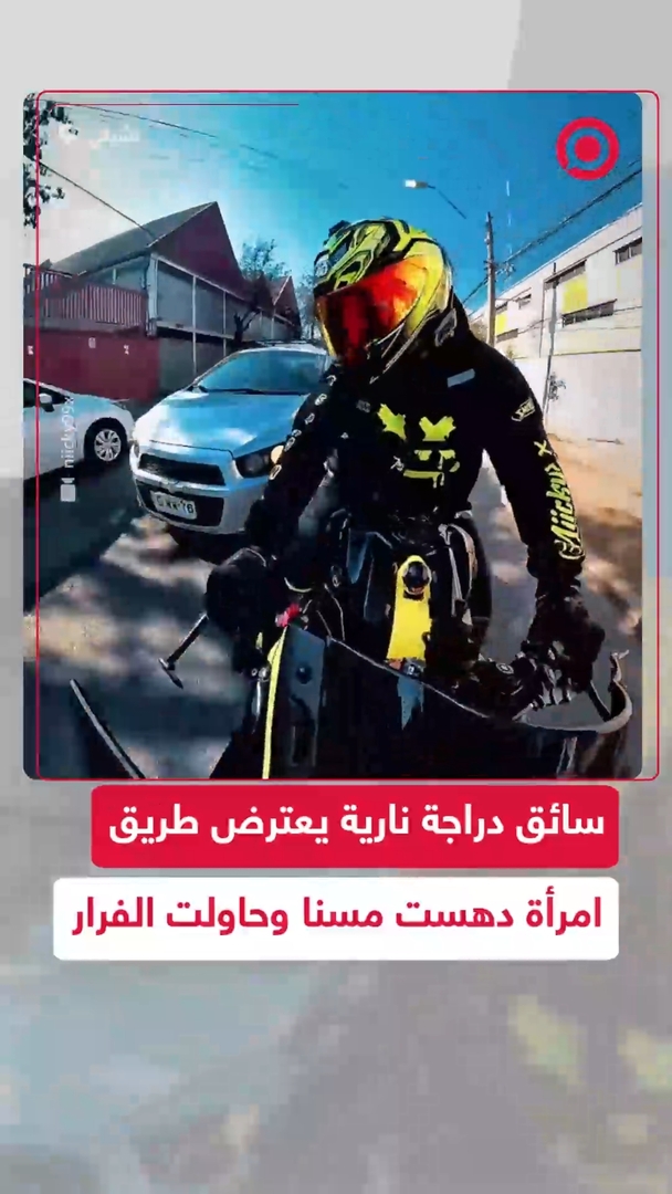 موقف بطولي في أحد شوارع تشيلي.. سائق دراجة نارية يقدم على اعتراض طريق امرأة صدمت رجلا مسنا بسيارتها وحاولت الفرار، ليمنعها بشجاعة من الإفلات دون محاسبة.
