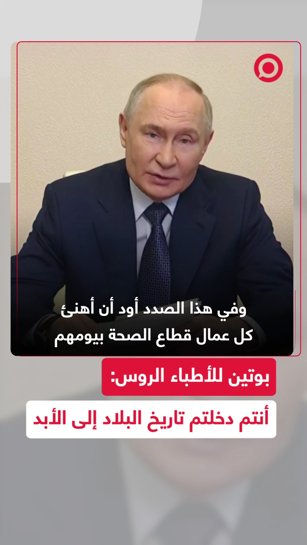 "أهنئ كل من اختار هذه المهنة الفضيلة والصعبة".. الرئيس الروسي فلاديمير بوتين، يشكر جميع العاملين في مجال الرعاية الصحية في روسيا، على إنجازاتهم المهنية.