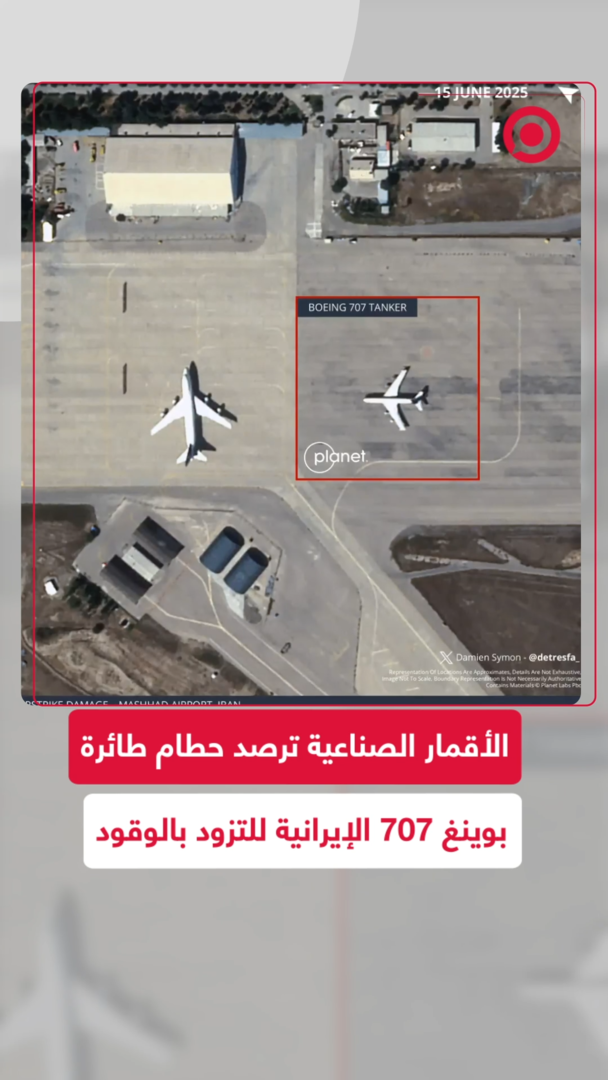 بعد قصفها من قبل إسرائيل في غارة جوية حديثة.. صور الأقمار الصناعية من مطار مشهد تظهر حطام طائرة بوينغ 707 الإيرانية للتزود بالوقود.