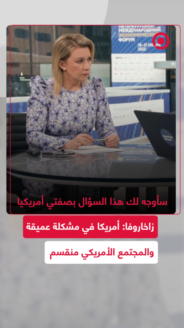 المتحدثة باسم الخارجية الروسية، ماريا زاخاروفا، تؤكد أن الشعب الأمريكي في الداخل منقسم وفي حالة انهيار، وذلك خلال لقائها على شاشة RT مع الصحفي الأمريكي ريك سانشيز على هامش منتدى بطرسبورغ الاقتصادي الدولي.