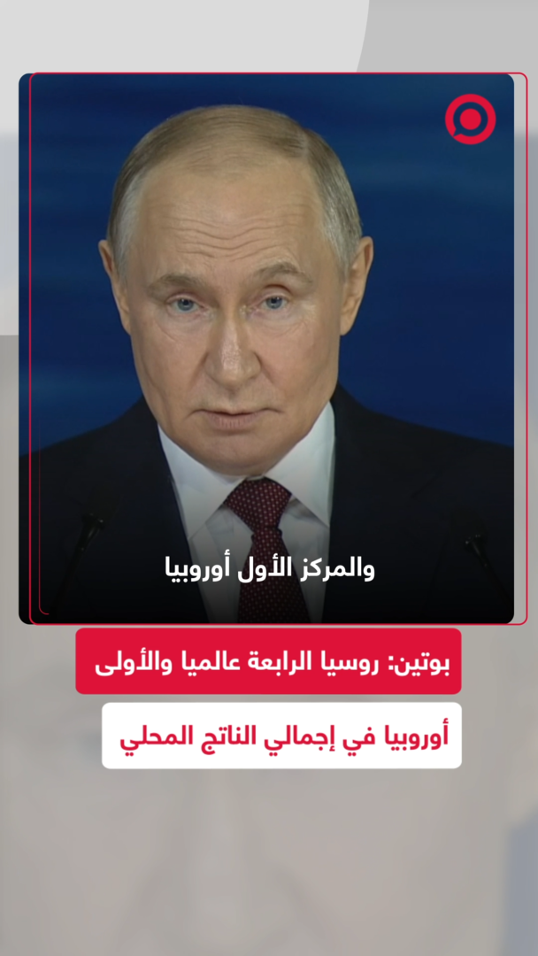 "روسيا تحتل المركز الرابع عالميا والأول أوروبيا من ناحية إجمالي الناتج المحلي".. الرئيس الروسي فلاديمير بوتين، يؤكد أهمية المحافظة على تفوق الاقتصاد الروسي في الأوساط الدولية وضرورة توفير بيئة مناسبة لرجال الأعمال والمستثمرين الأجانب. وذلك خلال كلمة الرئيس بوتين في الجلسة العامة لمنتدى بطرسبورغ الاقتصادي الدولي.