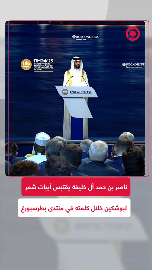 "تشبه سياسة الرئيس بوتين".. مستشار الأمن الوطني البحريني، الأمير ناصر بن حمد آل خليفة، يقتبس أبيات شعر من إحدى قصائد الشاعر الروسي بوشكين خلال كلمته في المنتدى الاقتصادي الدولي بسان بطرسبورغ