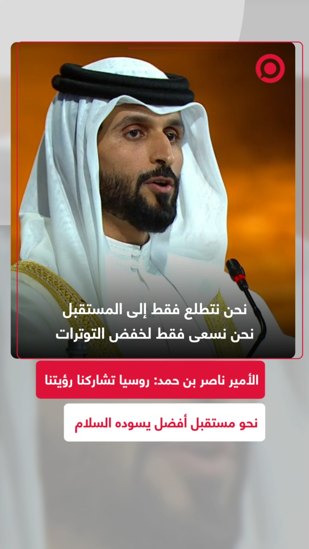 "كل يوم تشرق الشمس أمامنا، ولكن في مدينة بطرسبورغ لم أشهد بعد ظلام الليل".. مستشار الأمن الوطني البحريني، الأمير ناصر بن حمد آل خليفة، يؤكد أن روسيا تشارك بلده تطلعاتها نحو مستقبل أفضل خال من التوترات ويسوده السلام.