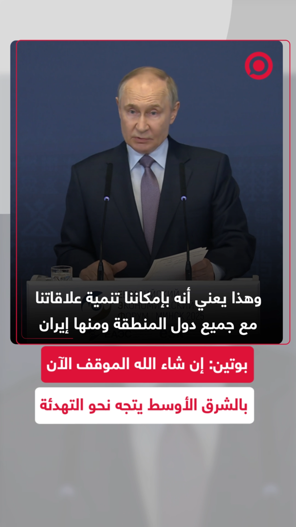 الرئيس الروسي فلاديمير بوتين: إن شاء الله، الموقف الآن بالشرق الأوسط يتجه نحو التهدئة.