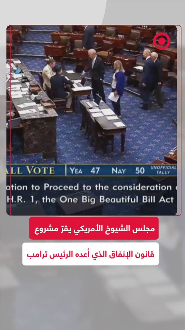 وصفه بـ "الانتصار الكبير".. مجلس الشيوخ الأمريكي يقرّ مبدئيا مشروع القانون الذي أعده الرئيس دونالد ترامب للضرائب والإنفاق، بعد تصويت إجرائي حاسم انتهى بأغلبية ضئيلة بلغت 51 صوتا مقابل 49، وسط معارضة شديدة من الديمقراطيين الذين يعتبرون أن القانون يفيد الأثرياء على حساب البرامج الاجتماعية.