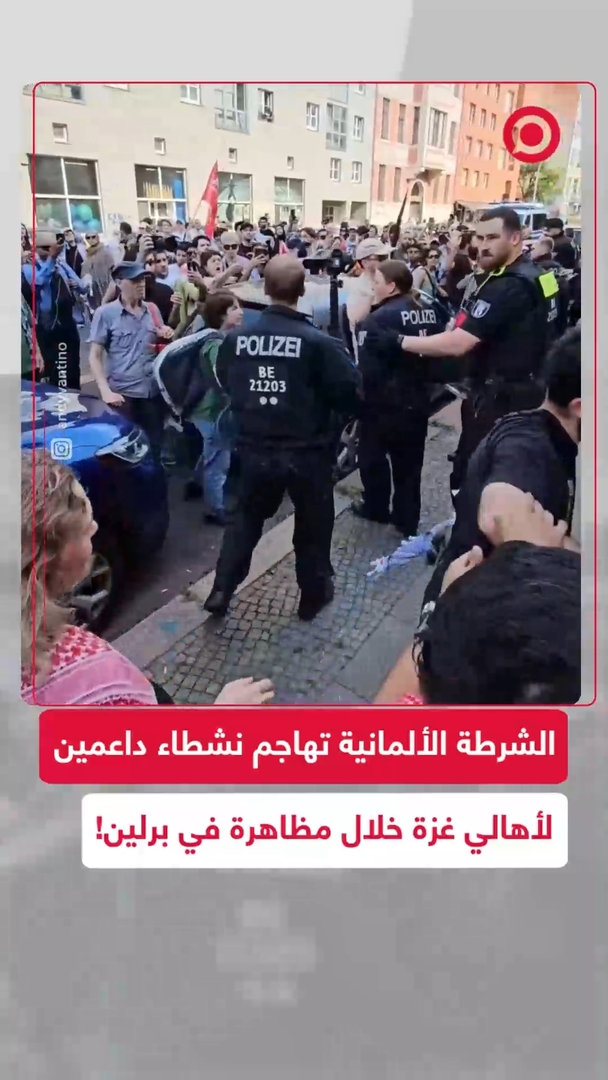 تصعيد جديد في قلب العاصمة الألمانية.. الشرطة الألمانية تهاجم نشطاء تجمعوا في وقفة سلمية دعما لفلسطين، وتعتقل عددا منهم وسط هتافات منددة بالحرب الإسرائيلية المستمرة على قطاع غزة.