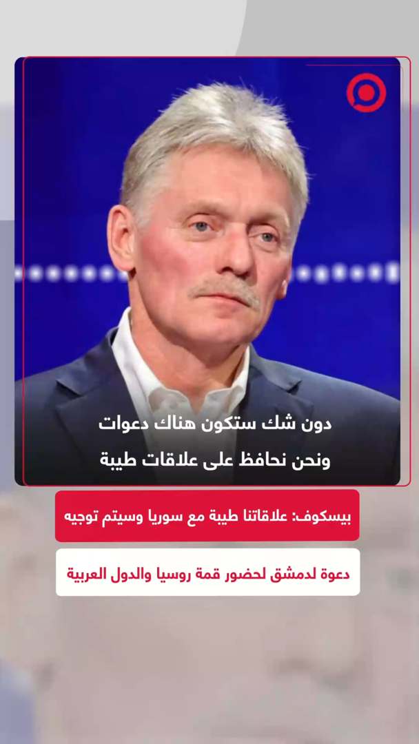 المتحدث باسم الكرملين، دميتري بيسكوف، يصرح بأنه سيتم توجيه دعوات إلى السلطات السورية لحضور قمة روسيا وجامعة الدول العربية المقررة في أكتوبر المقبل، مشيرا إلى أن روسيا تحافظ على علاقات طيبة مع القيادة السورية.