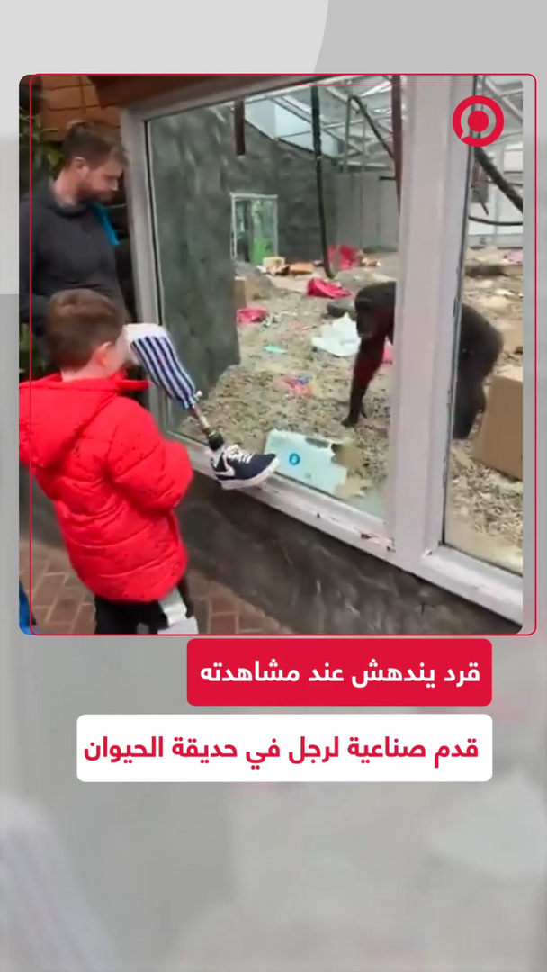 قرد يتفاجأ عند رؤيته قدما صناعية لرجل خلف الزجاج