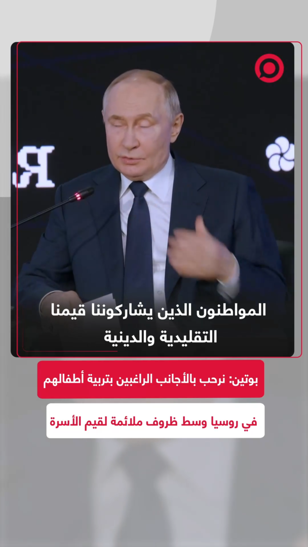 "نرحب بمن يأتي إلينا".. الرئيس الروسي فلاديمير بوتين يؤكد ترحيب روسيا بالأجانب المتعلمين وذوي الخبرة ممن لديهم الرغبة في العمل والعيش وتربية أطفالهم في ظروف يعتبرونها ملائمة لصون الأسرة وقيمها داخل روسيا