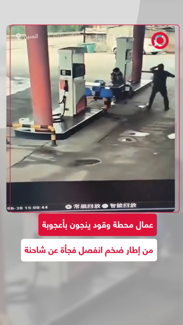 عمال محطة وقود في الصين ينجون بأعجوبة بعد اصطدام إطار شاحنة بالمحطة
