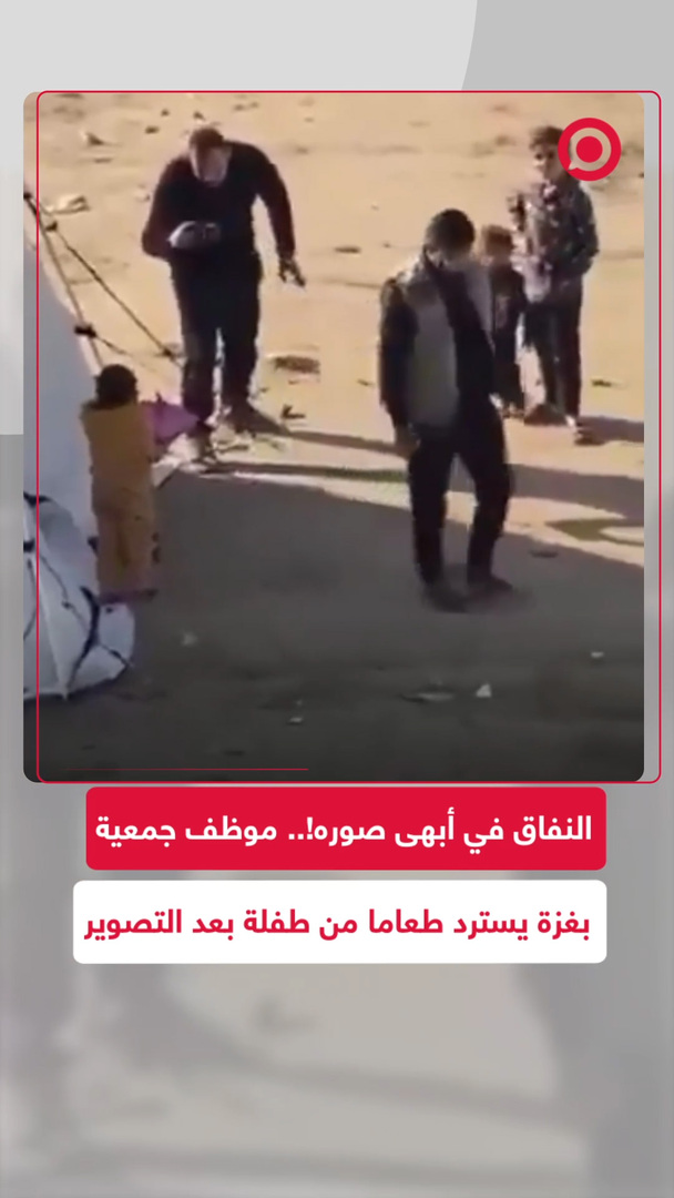 النفاق في أبهى صوره!.. مشهد مؤلم لقيام موظف بجمعية خيرية في غزة حيث أعطى طفلة صغيرة طعاما ثم استرده بعد التقاط صورة!.