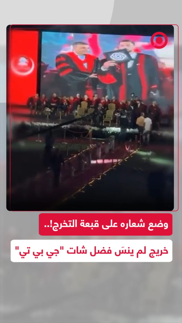 أحد الطلبة الخريجين يرفع قبعته عاليًا أثناء استلام شهادة التخرج، وقد تصدّرها شعار شات "جي بي تي".