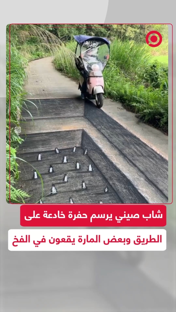 خداع بصري أربك العابرين 🕳️.. شاب صيني يرسم حفرة ثلاثية الأبعاد على طريق فرعي بطريقة مذهلة، ما جعل بعض المارة يغيرون مسارهم ظنا أنها حقيقية.