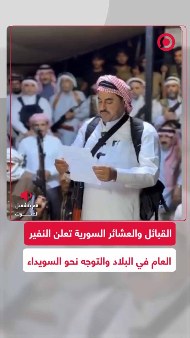 "على كل القبائل التوجه إلى السويداء لإنقاذ أهلنا من التطهير العرقي".. عبدالمنعم الناصيف، رئيس مجلس القبائل والعشائر السورية، أصدر بيانا رسميا يدعو كل القبائل والعشائر السورية للتوجه نحو السويداء لإنقاذ العشائر من الفصائل الدرزية هناك مما أسماه "التطهير العرقي"