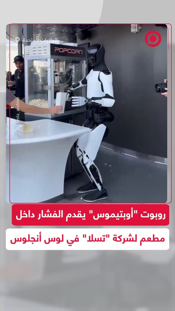 المستقبل يبدأ من هنا 🤖🍿.. في مطعم "تسلا" الجديد داخل مدينة لوس أنجلوس، ظهر الروبوت الشهير "أوبتيموس" وهو يقدم الفشار للزوار، في مشهد يجسد حلم التحول نحو خدمة روبوتية ذكية بالكامل.
