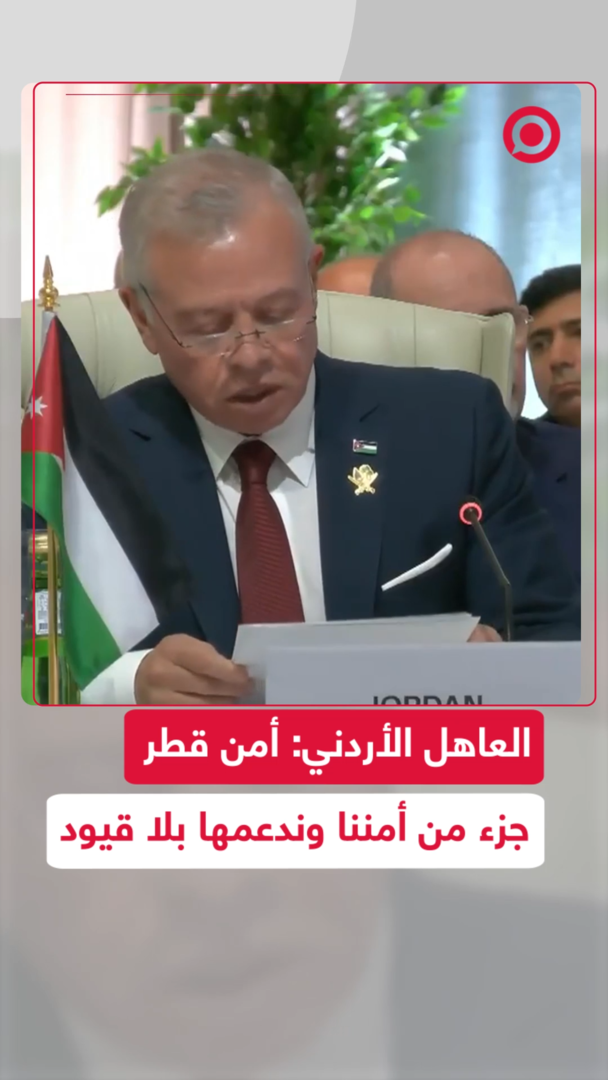العاهل الأردني الملك عبدالله الثاني، خلال كلمته بالقمة العربية الإسلامية الطارئة بالدوحة، يقول إن "أمن قطر هو أمن الأردن واستقرارها استقرارنا"، مؤكدا الدعم المطلق لقطر في مواجهة أي تهديد أمني.
