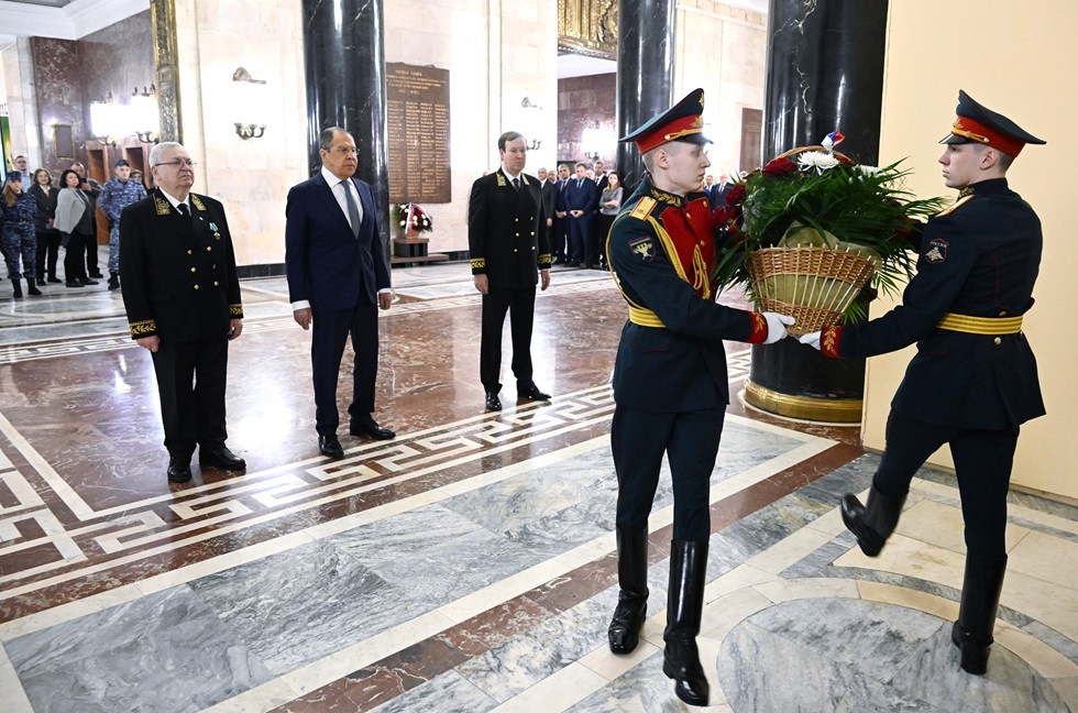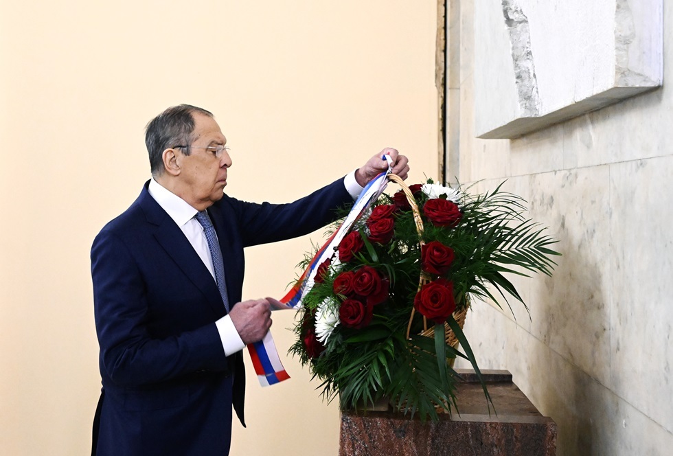 وقد وضع لافروف إكليلا من الزهور عرفانا وتحية وإحياء لذكرى الذين ماتوا موت الشجعان على جبهات الحرب الوطنية العظمى، وكذلك الرفاق الذين ماتوا أثناء أداء واجبهم، ومن ثم أصبحوا ضحايا القمع السياسي.