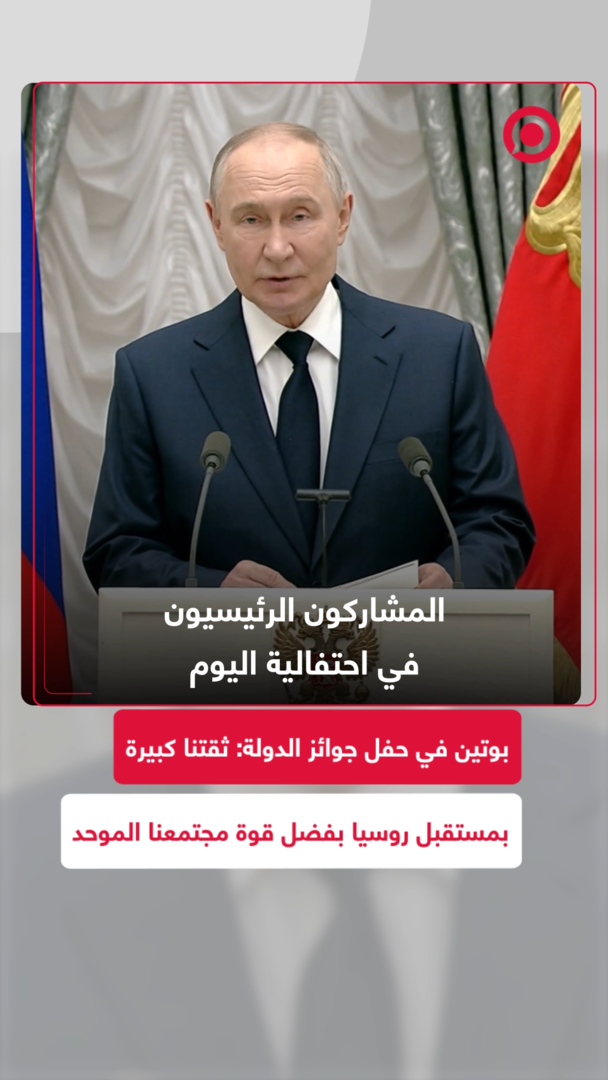 Play/Pause Mute/Unmute بوتين في حفل جوائز الدولة: ثقتنا كبيرة بمستقبل روسيا بفضل قوة مجتمعنا الموحد Save post Share Facebook X VK.com Telegram