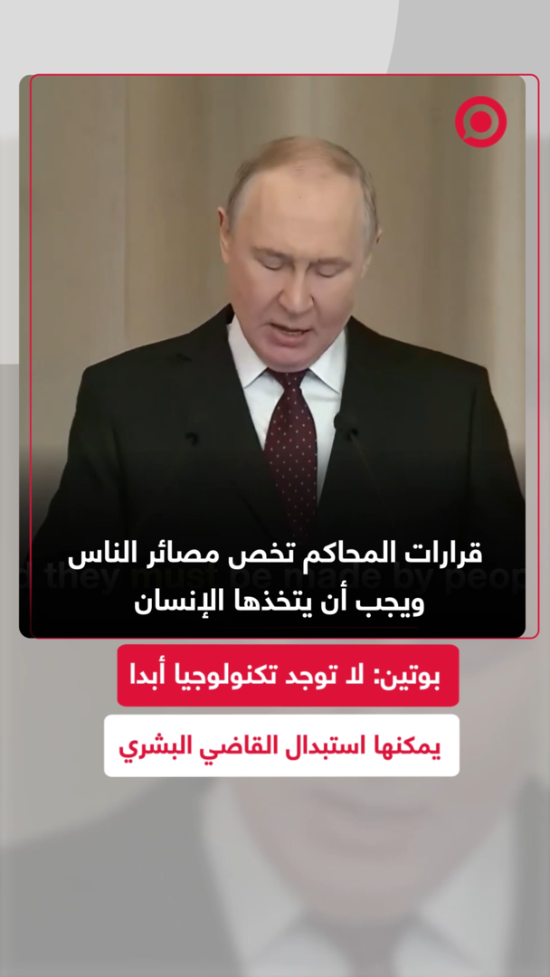 Play/Pause Mute/Unmute بوتين: لا توجد تكنولوجيا يمكنها استبدال القاضي البشري، لأنه وحده القادر على فهم أدق التفاصيل Save post Share Facebook X VK.com Telegram