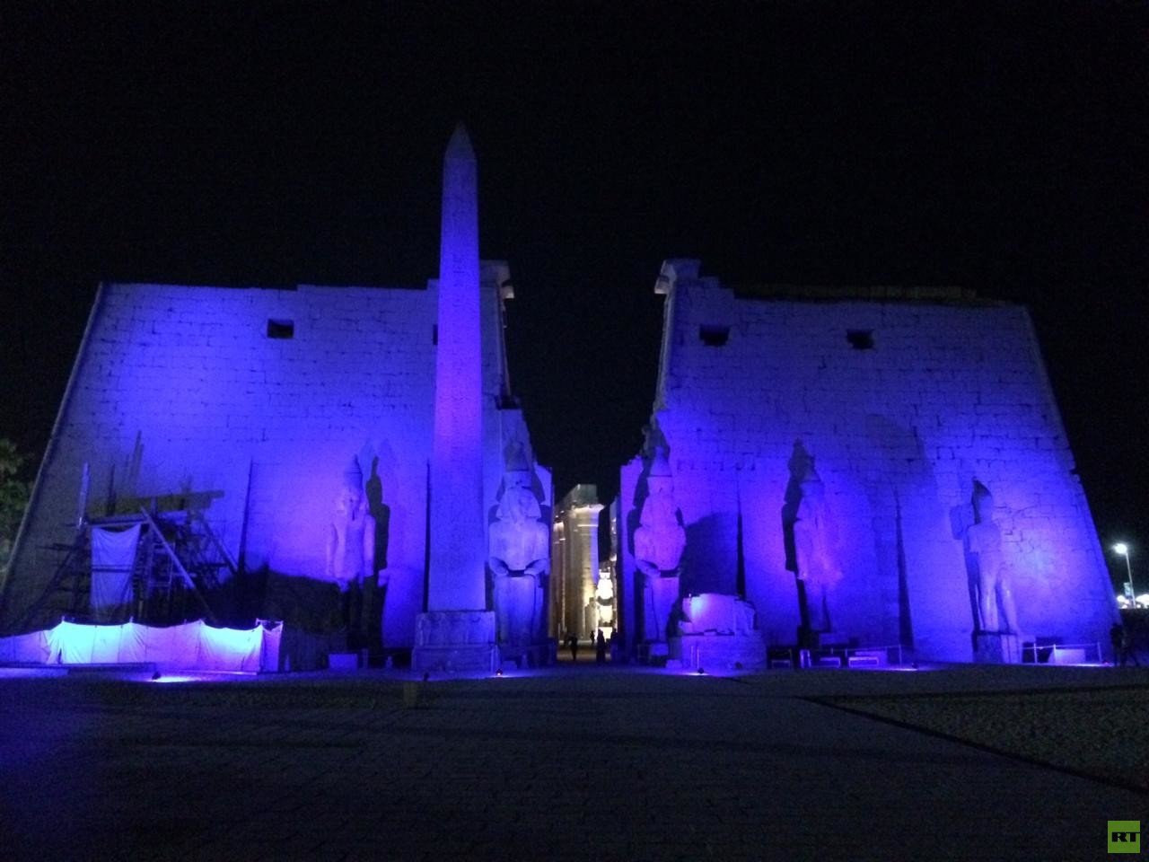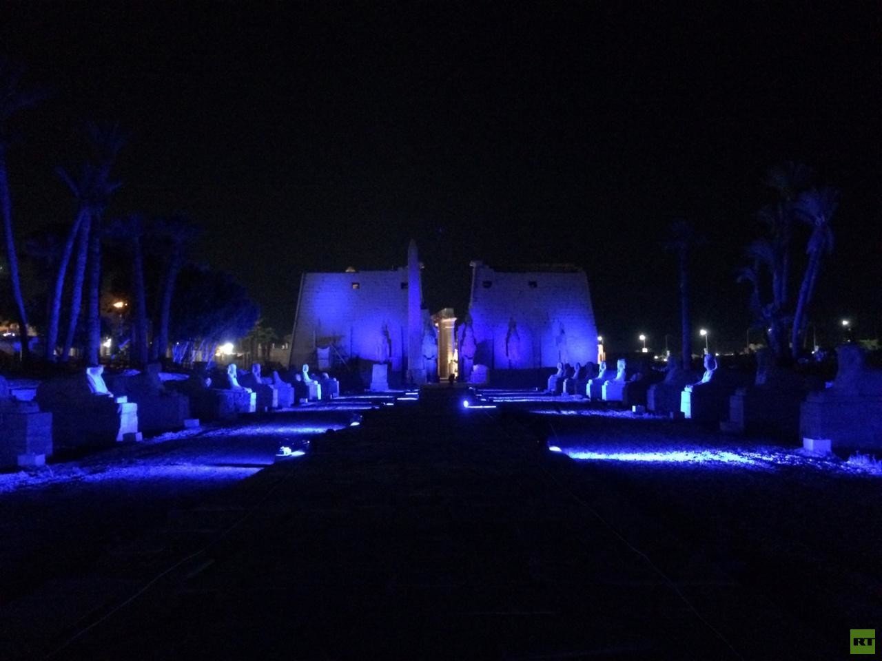 أضاء اللون الأزرق معبد الأقصر وطريق الكباش في مصر لمدة ساعة، إحياء لليوم العالمي للتوحد، الذي يحل في 2 أبريل من كل عام.