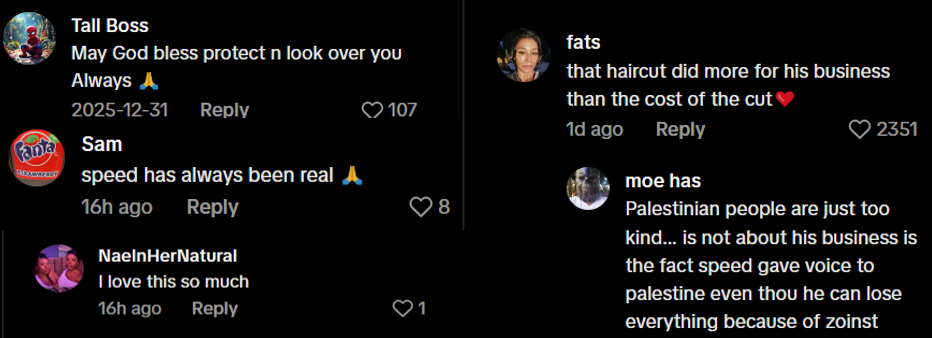 وقال أحدهم معلقا: "لقد أفادت قصة الشعر هذه عمله بأكثر مما استحقته تكلفة الحلاقة نفسها"، ليرد عليه حساب آخر بالقول: ""الشعب الفلسطيني لطيف للغاية... الأمر لا يتعلق بعمله، بل بحقيقة أن 'سبيد' (Speed) أعطى صوتا لفلسطين، رغم أنه قد يخسر كل شيء بسبب الصهاينة".