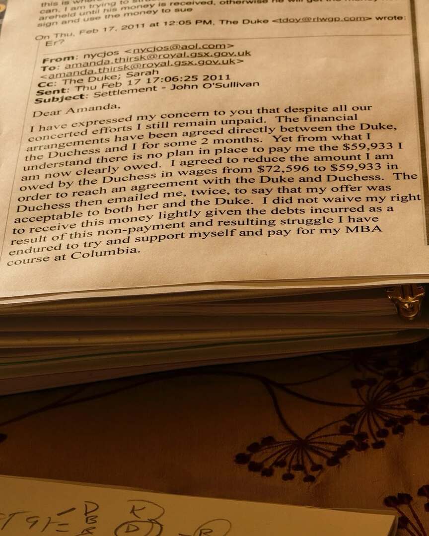 وهذه المراسلات المؤرخة في فبراير عام 2011، كانت بين جون أوسوليفان المساعد الشخصي السابق لسارة فيرغسون، وأماندا ثيرسك السكرتيرة الخاصة السابقة لأندرو.