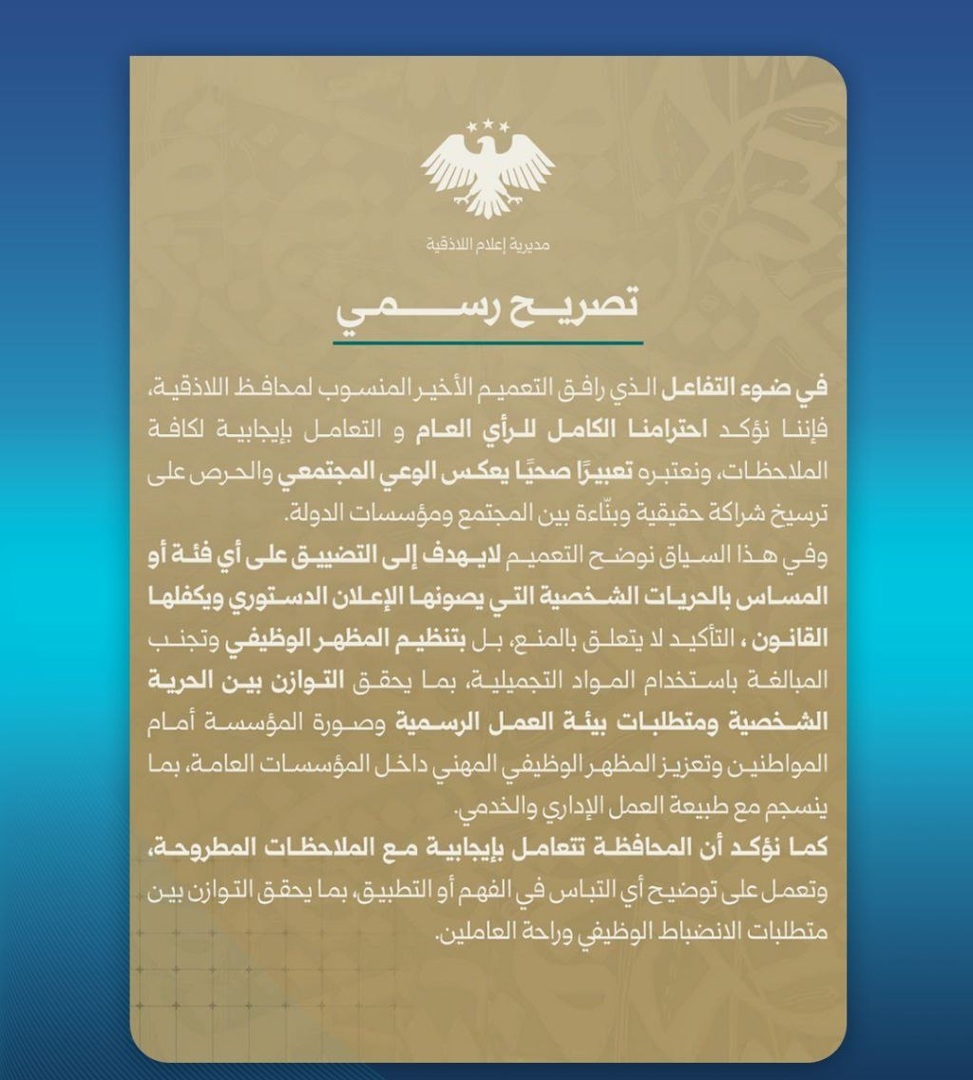 وأكدت مديرية الإعلام في اللاذقية أن "المحافظة تتعامل بإيجابية مع الملاحظات المطروحة، وتعمل على توضيح أي التباس في الفهم أو التطبيق، بما يحقق التوازن بين متطلبات الانضباط الوظيفي وراحة العاملين".