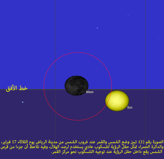 ولفت المركز إلى تفاصيل صورة تعبيرية نشرها قائلا: "وضع الشمس والقمر عند غروب الشمس من مدينة الرياض، والدائرة الحمراء تمثل حقل الرؤية لتلسكوب عادي يستخدم لرصد الهلال، وفيه نلاحظ أن جزءا من الشمس يقع داخل حقل الرؤية عند توجيه التلسكوب نحو مركز القمر".