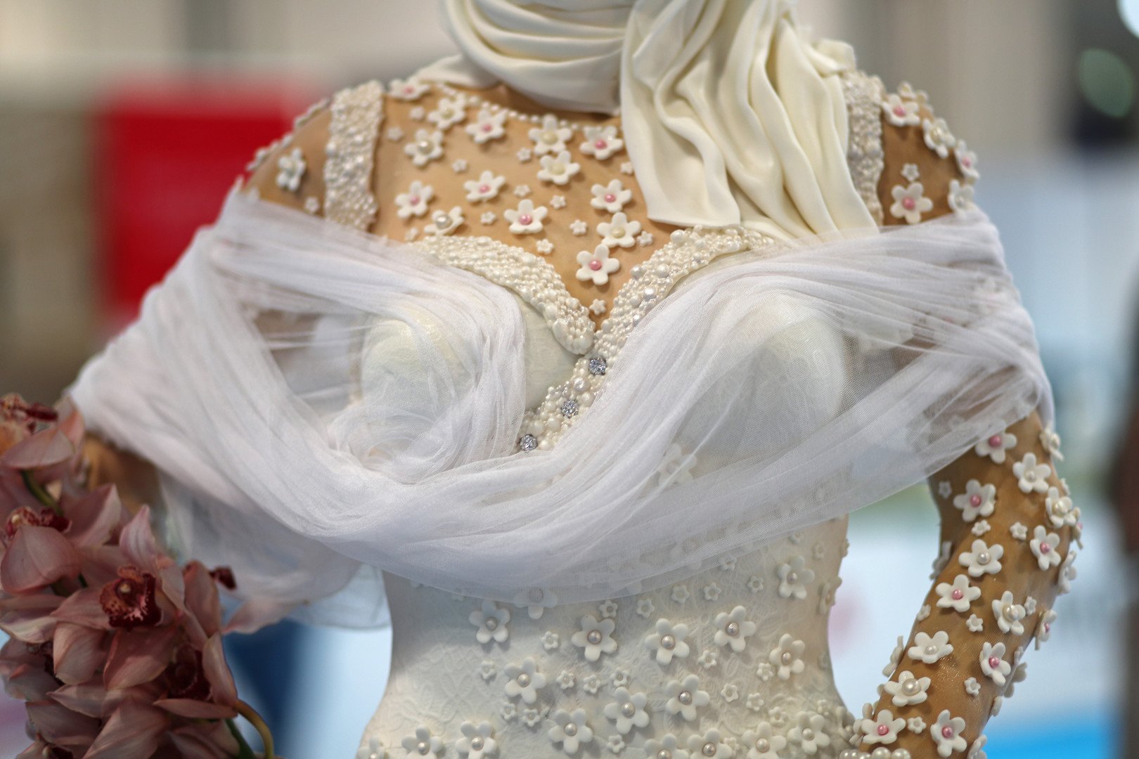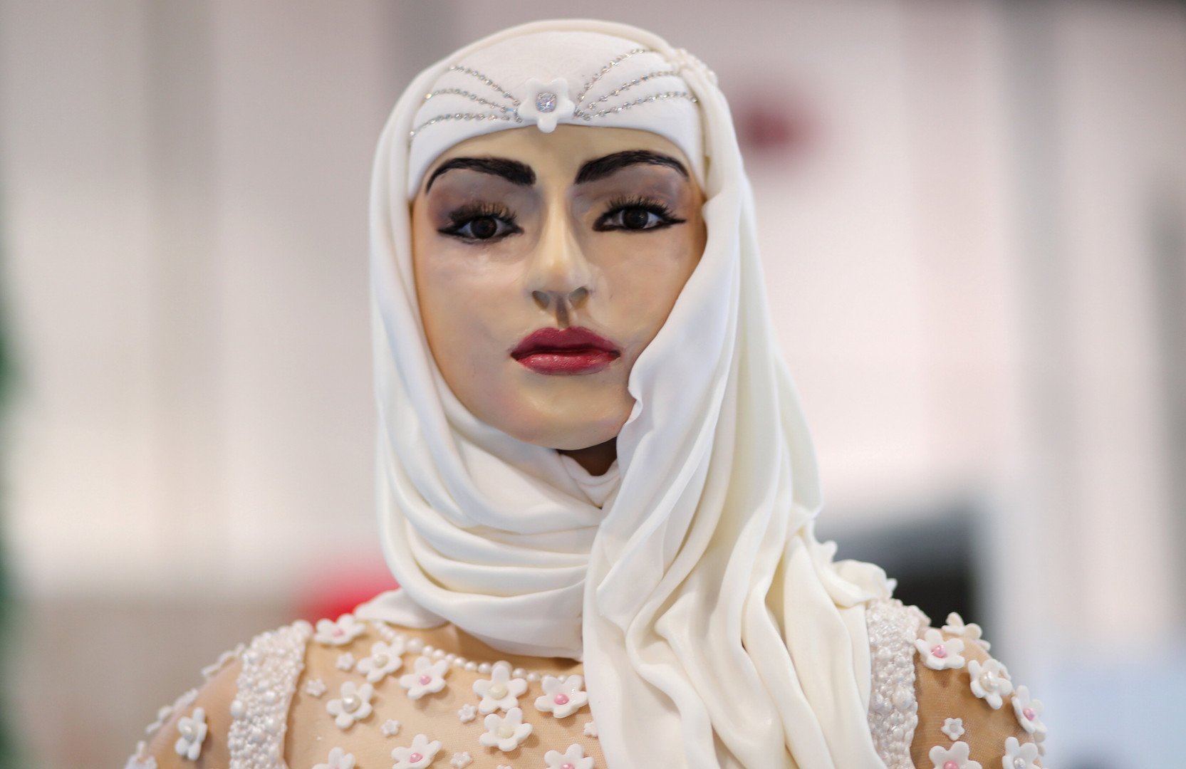 عُرضت في Dubai Bride Show كعكة زفاف غير عادية، مصنوعة على شكل فتاة محجبة ترتدي فستان العروس الأبيض بحجمها الطبيعي، لكن ذلك ليس كل ما يميز الكعكة.