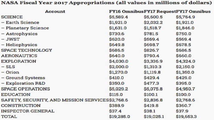 يذكر أن موازنة ناسا للعام المالي 2016 بلغت 19.3 مليار دولار، حيث تعد من أكبر الموازنات الفضائية في العالم، وتشغل موازنة الوكالة الفضائية الأوروبية بـ5.7 مليار دولار المرتبة الثانية.
