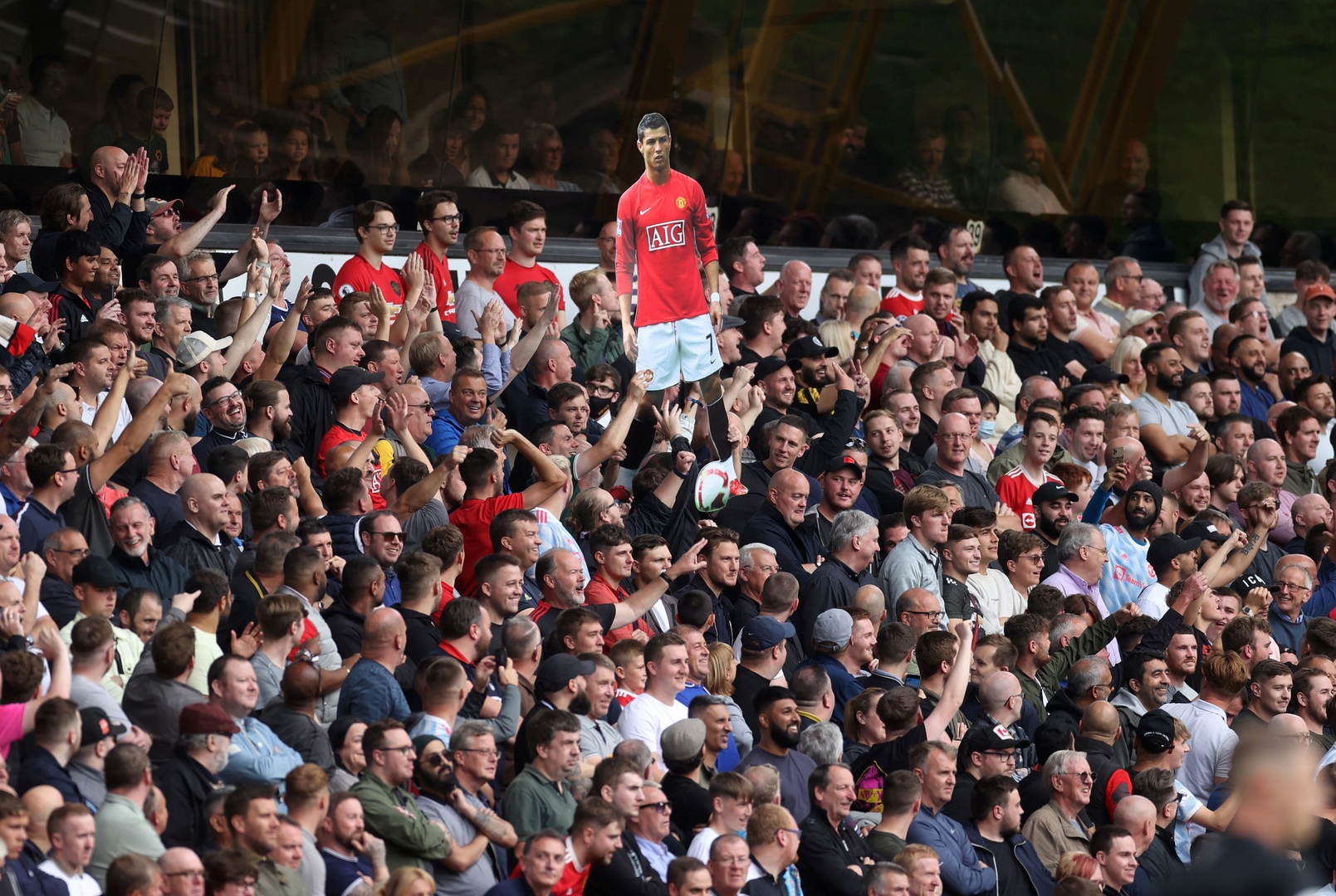 وقام بعض جماهير يونايتد، برفع مجسم عليه صورة رونالدو في ملعب "مولينيو"، مع ترديد اسمه، للتعبير عن سعادتهم الكبيرة بعودة أسطورتهم إلى فريقه.