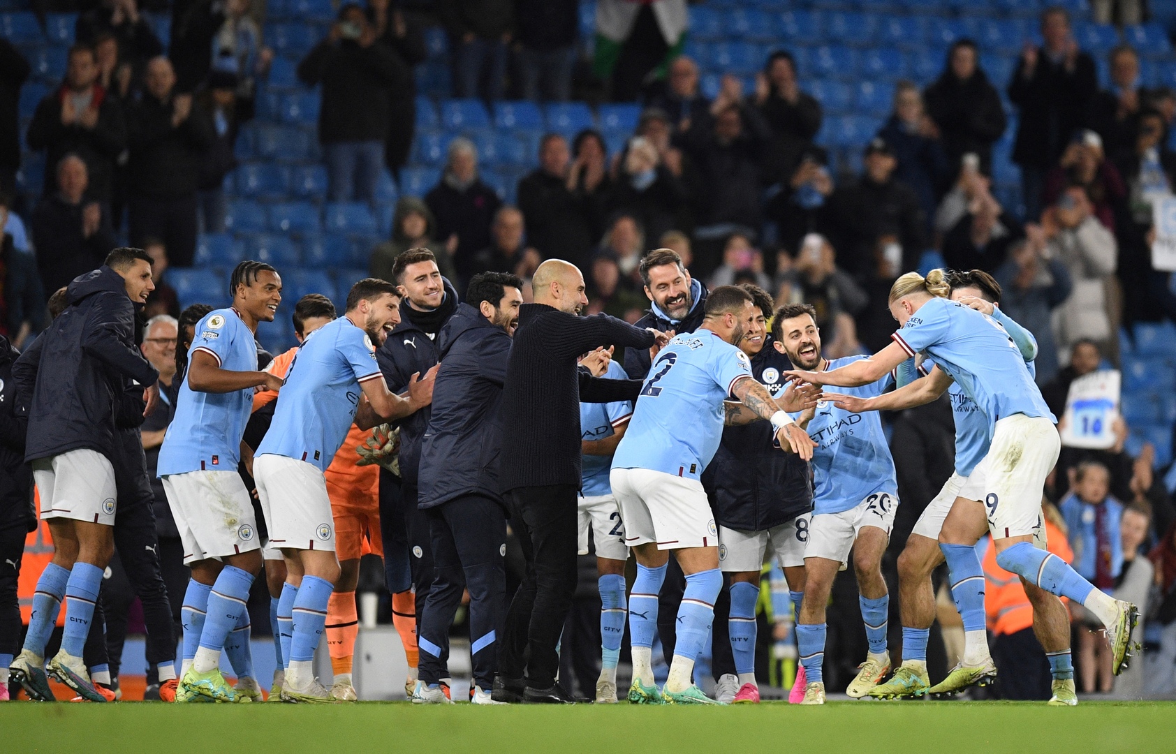 ونظم لاعبو مانشستر سيتي، ممرا شرفيا لزميلهم في الفريق، هالاند بعد تحقيقه الرقم القياسي الخاص بأكثر اللاعبين تسجيلا للأهداف في موسم واحد البريميرليغ.