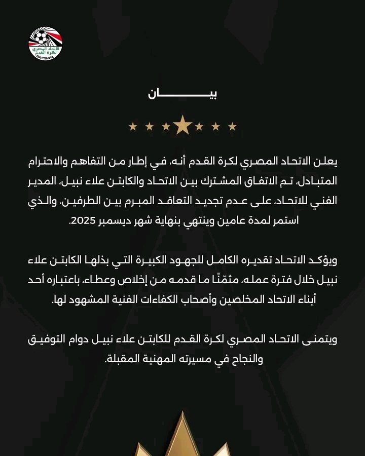 وقال اتحاد الكرة في بيانه: "يعلن الاتحاد المصري لكرة القدم أنه في إطار من التفاهم والاحترام المتبادل تم الاتفاق المشترك بين الاتحاد وعلاء نبيل، المدير الفني للاتحاد على عدم تجديد التعاقد المبرم بين الطرفين والذي استمر لمدة عامين وينتهي بنهاية شهر ديسمبر 2025".