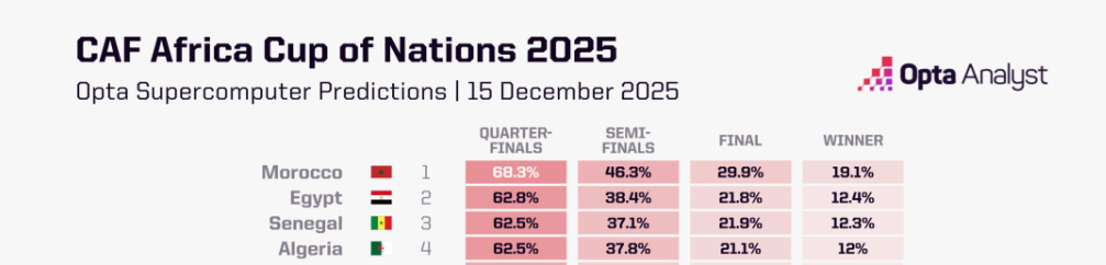 ووفقا لنموذج التنبؤ الإحصائي لـ"أوبتا"، فإن المغرب، الجزائر، مصر، والسنغال هي المنتخبات الأوفر حظا للتأهل إلى المربع الذهبي.