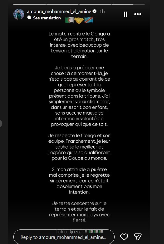 وأضاف النجم الجزائري: "أحترم الكونغو الديمقراطية ومنتخبهم تماما، وأتمنى لهم التوفيق في قادم المواعيد والتأهل لكأس العالم. إذا تم فهم تصرفي بشكل خاطئ، فإنني أعتذر بصدق، فتركيزي دائما منصب على تمثيل بلدي بفخر.. تحيا الجزائر".