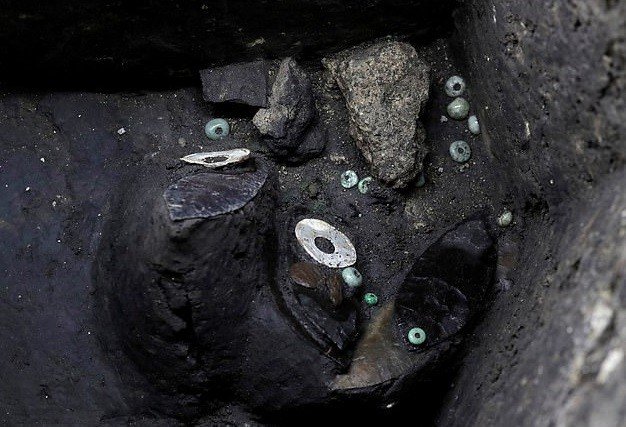 كما عثر العلماء في القبر الذي تم استكشافه جزئيا، على مجموعة من السكاكين صنعت من الحجر الصوان المصقول، مرصعة باللؤلؤ والأحجار الكريمة.