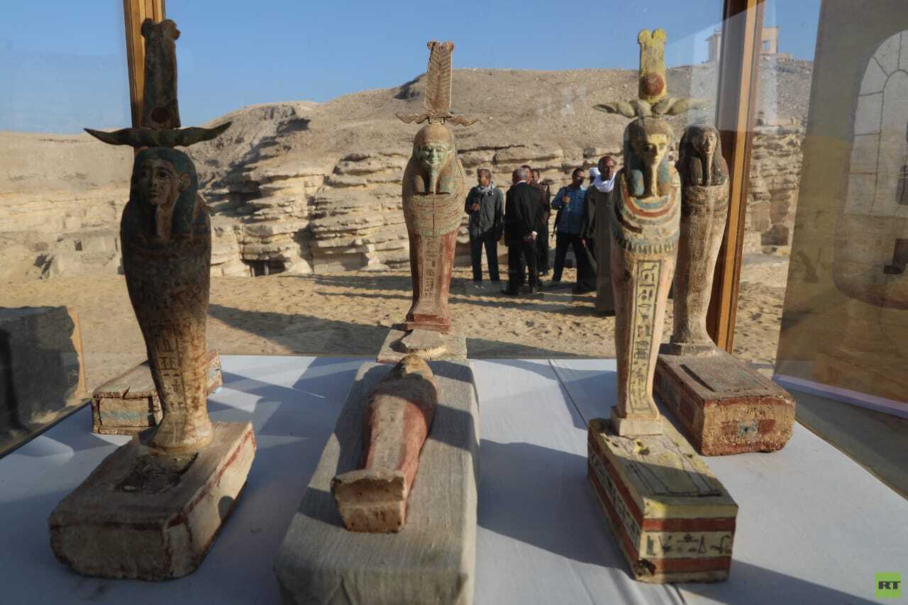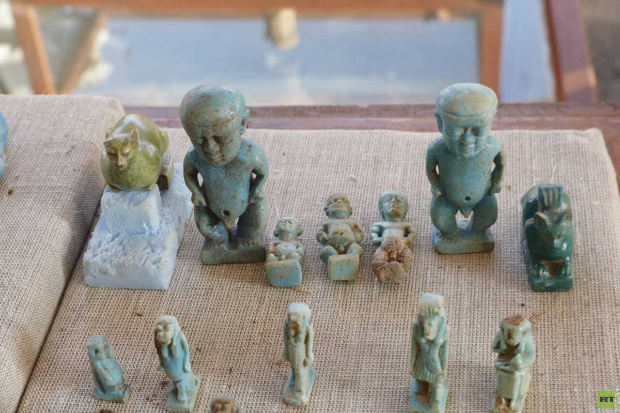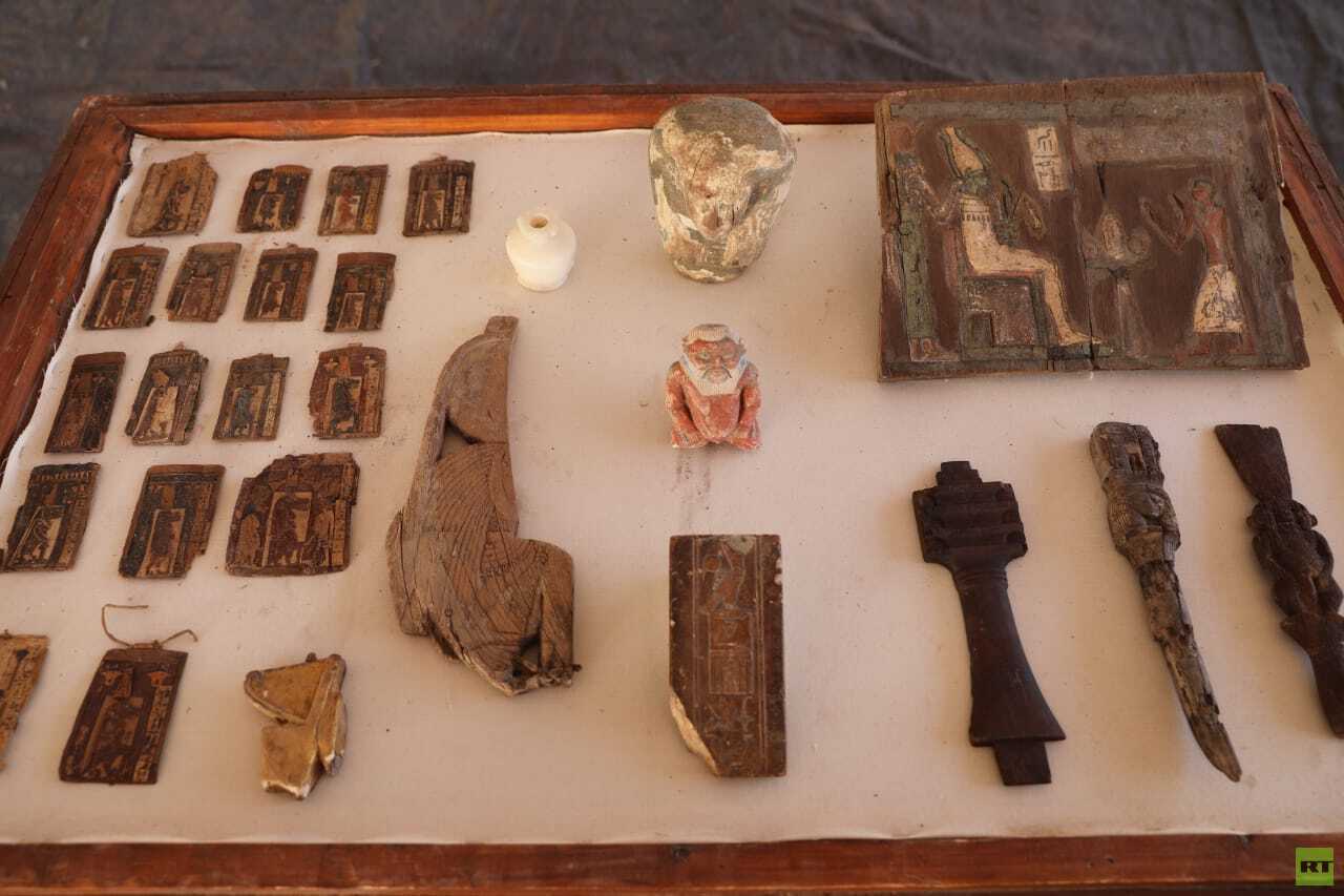 وأشار المسؤول إلى "أن البعثة عثرت أيضا على تابوتين صغيرين من الحجر الجيري للقطة باستت وكذلك لوحة حجرية عليها اسم الملك بسماتيك الأول من الأسرة 26 وصندوقا خشبيا صغيرا عليه بقايا قناع مذهب وتمثالين من الخشب لسيدتين كل منهما برأس الكوبرا، بالإضافة إلى العديد من تماثيل الكوبرا وإفريز من الخشب يمثل حيات الكوبرا وتمائم ورأس طائر أبو منجل، وكذلك 3 تماثيل للصقر حورس و مجموعة من التمائم مختلفة الأشكال والأحجام بعضها عثر عليه داخل لفائف من الكتان وتماثيل اوشابتى من الفيانس ومجموعة من البطاقات من ورق البردي عليها رسومات للآلهة تاورت والعديد من الأقنعة الخشبية والطينية الملونة وعمود الجد، ومسند راس خشبي.