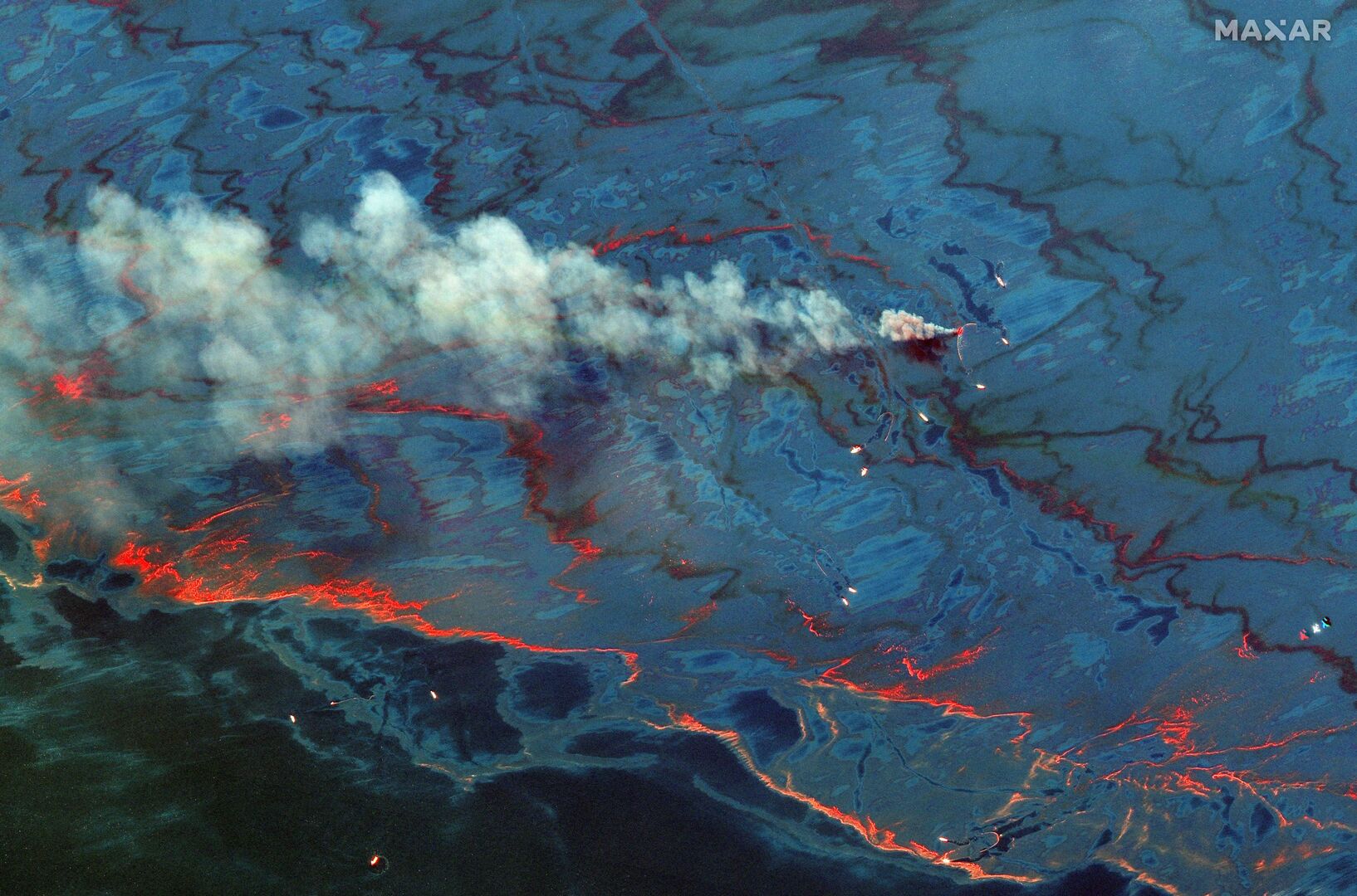 كان تسرب النفط في أعماق البحر في خليج المكسيك، الأكبر في التاريخ. وأدى انفجار وقع في 20 أبريل 2010 إلى تدمير منصة BP، ما تسبب في إطلاق أكثر من 3 ملايين برميل من النفط في الخليج على مدار 87 يوما. وكانت لهذا الحادث آثار اقتصادية وبيئية واسعة النطاق في خليج المكسيك وكذلك لويزيانا وألاباما وميسيسيبي وفلوريدا. وتُظهر الصورة متعددة الأطياف للقمر الصناعي WorldView-2، بقعا كبيرة من النفط، وقع حرق بعضها كجزء من جهود التخفيف من التسرب.