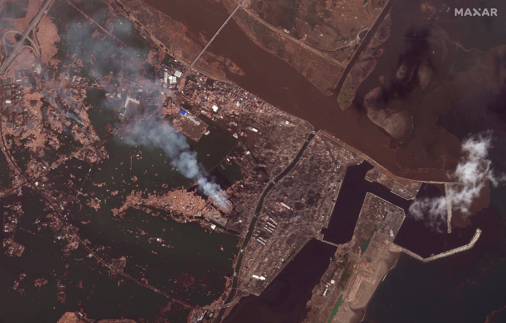 وتُظهر صور WorldView-2 الدمار الذي خلفه تسونامي في خليج هيرورا خارج سينداي باليابان.