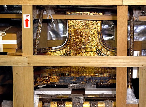 ونُقل السرير المذهب العائد لقبر توت عنخ آمون، الذي اكتشفه عالم الآثار البريطاني، هوارد كارتر، في عام 1922، خلال شهر مايو الفائت، ضمن حاويات خشبية معبأة بمواد لحمايتها من الحرارة والاهتزاز.