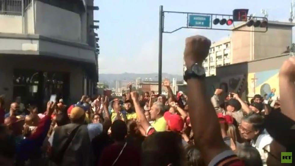 ويبدو في الشريط، العشرات من المؤيدين للرئيس مادورو، وهم يغنون ويرقصون، دعما للسلطة الشرعية والرئيس مادورو.