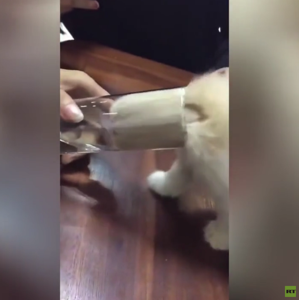 انتشر مقطع فيديو لقطة تحاول شرب الماء من كأس زجاجي ضيق العنق.