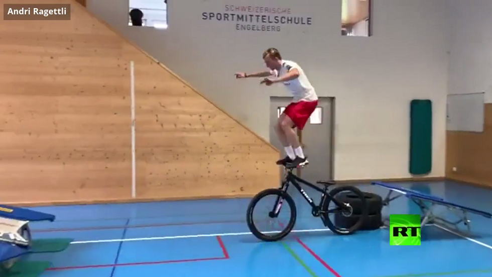 تداول رواد مواقع التواصل الاجتماعي فيديو للمتزلج السويسري أندريه راغيتلي، وهو يؤدي سلسلة رائعة من الحركات الرياضية خلال وقت قصير لم يتعد بضع ثوان.