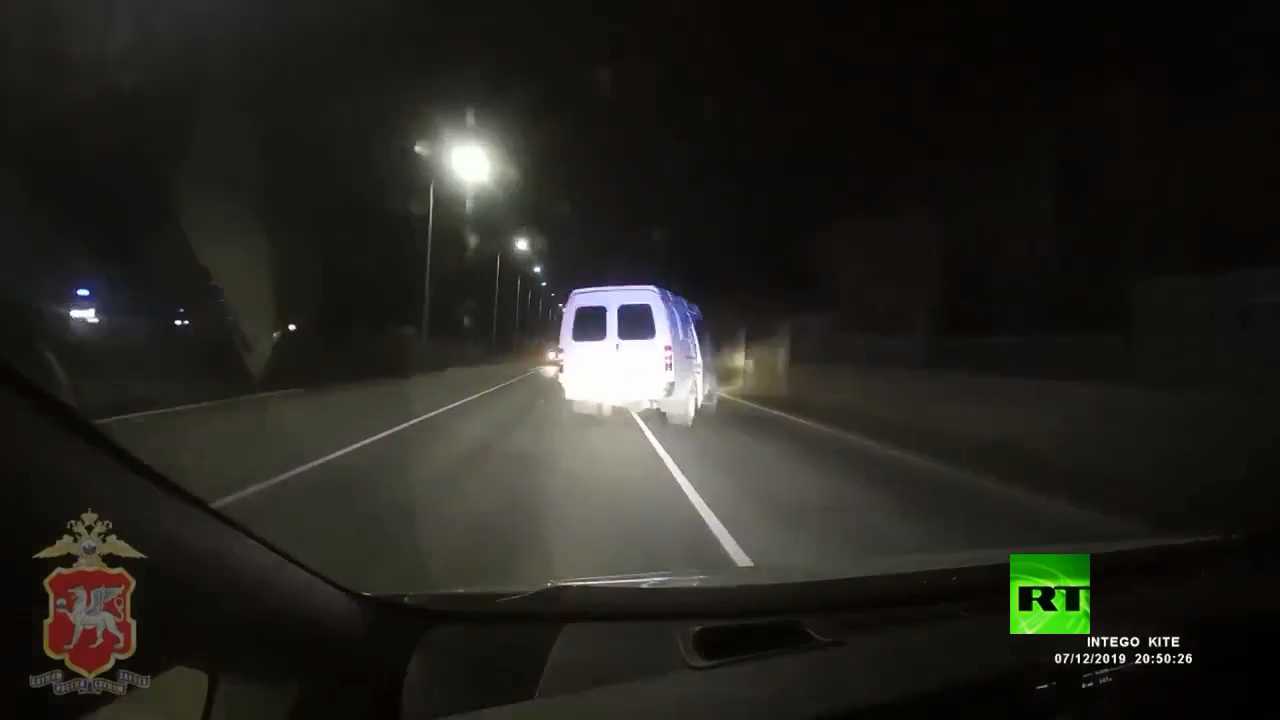 أظهرت كاميرا مركبة على سيارة شرطة لقطات من مطاردة بوليسية في شوارع فيودوسيا الروسية.