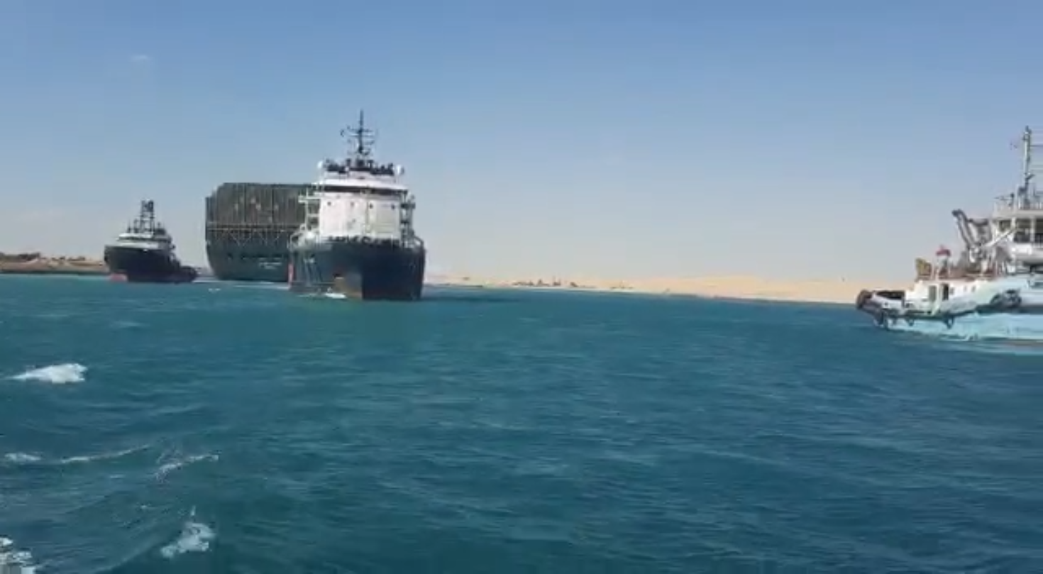 نشرت هيئة قناة السويس المصرية، فيديو للحظة قطر السفينة العالقة في القناة بعد حل الأزمة.