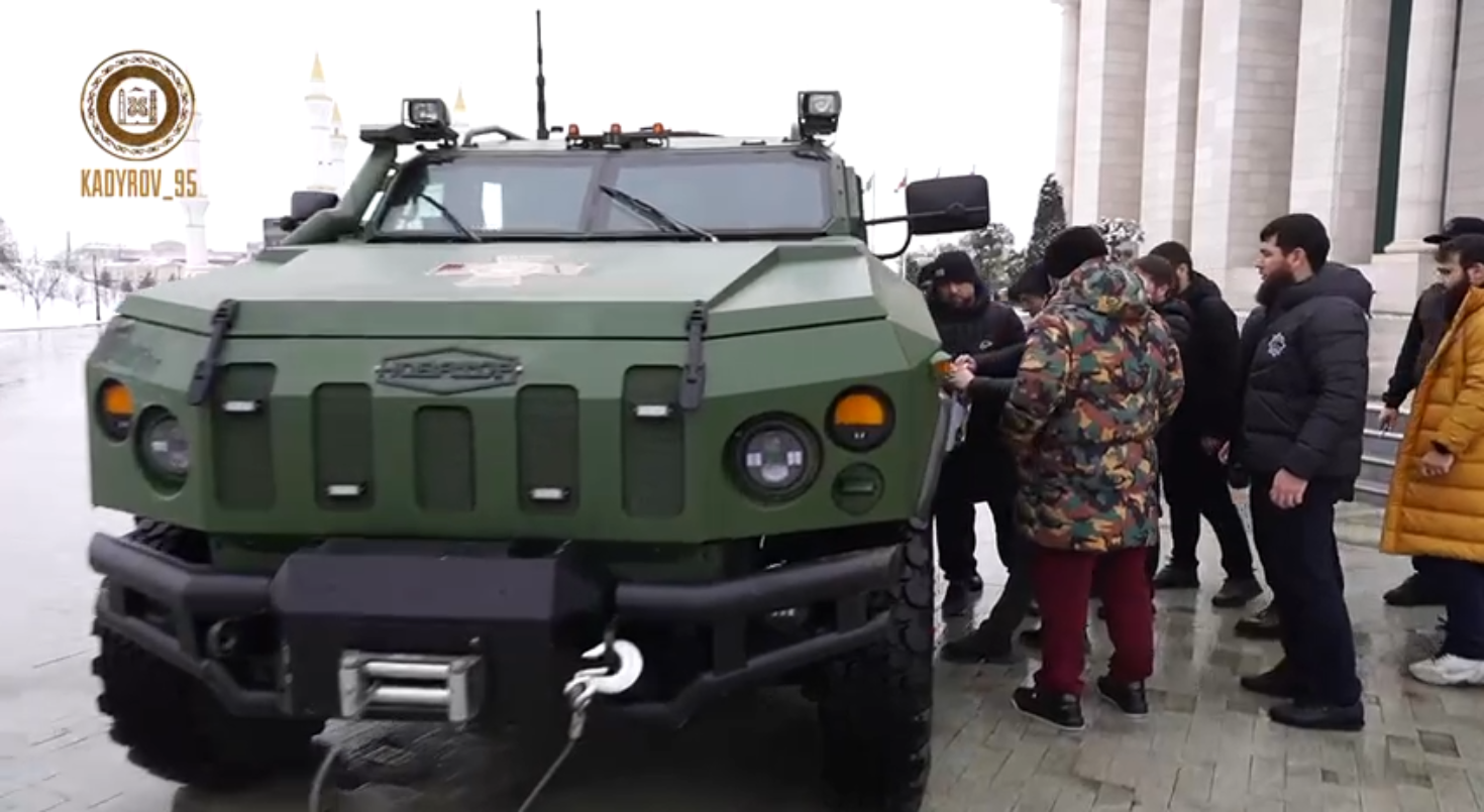 وتظهر لقطات رئيس جمهورية الشيشان وهو يقود الغنيمة الأوكرانية في أحد شوارع غروزني.